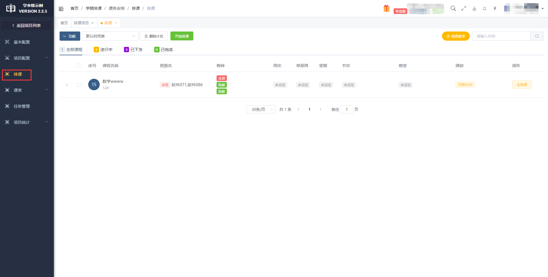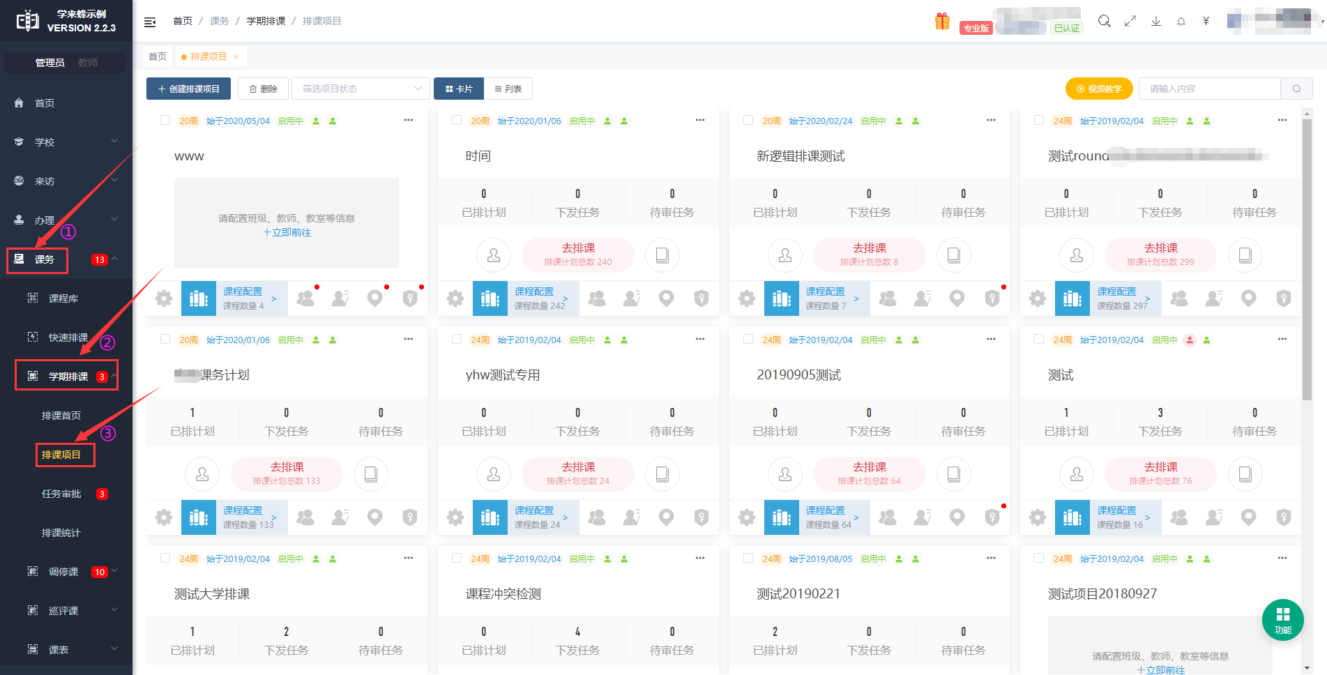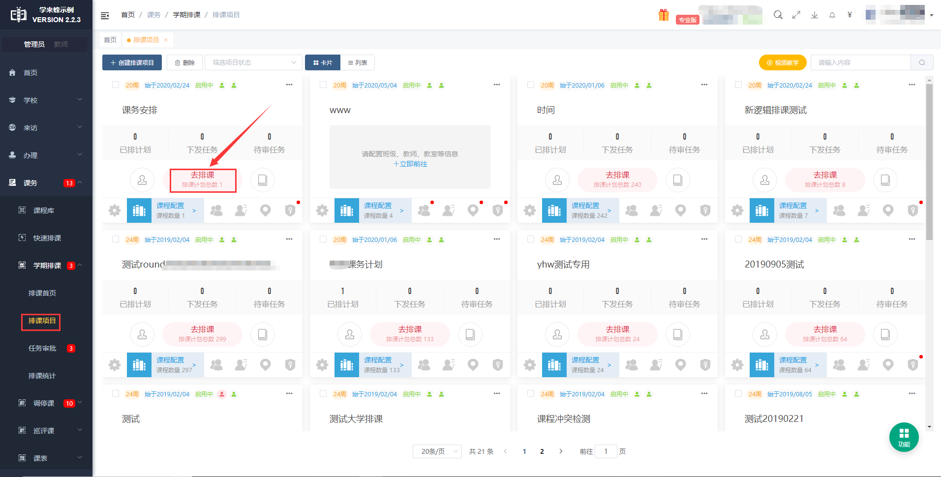 点击课务按钮,选择学期排课中的排课项目选项,进入排课项目页面