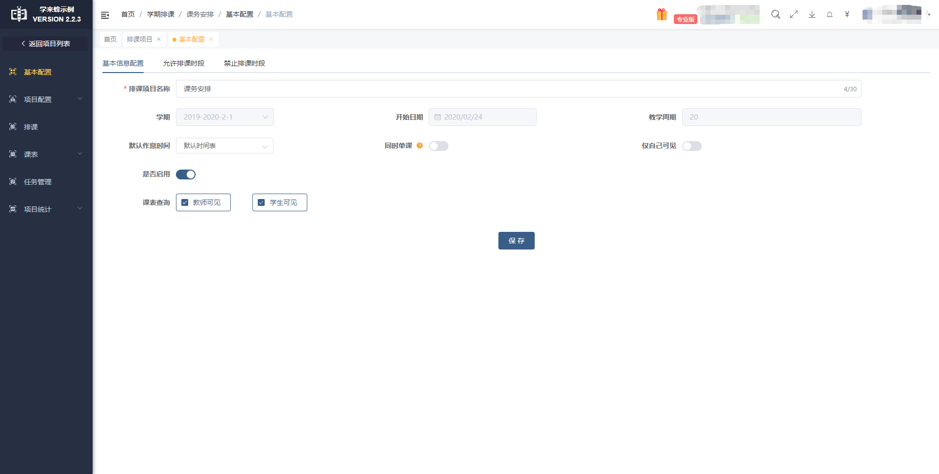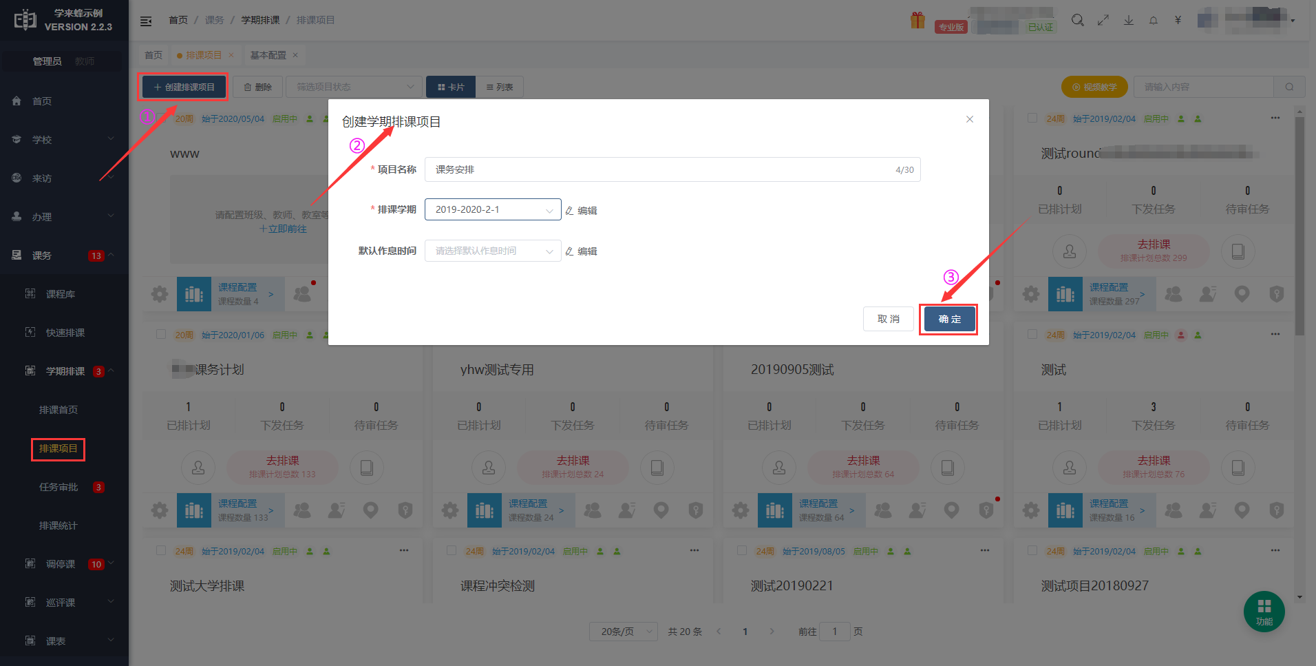点击创建排课项目按钮,弹出创建学期排课项目页面,填写信息点击确定按钮,完成创建新的排课项目。