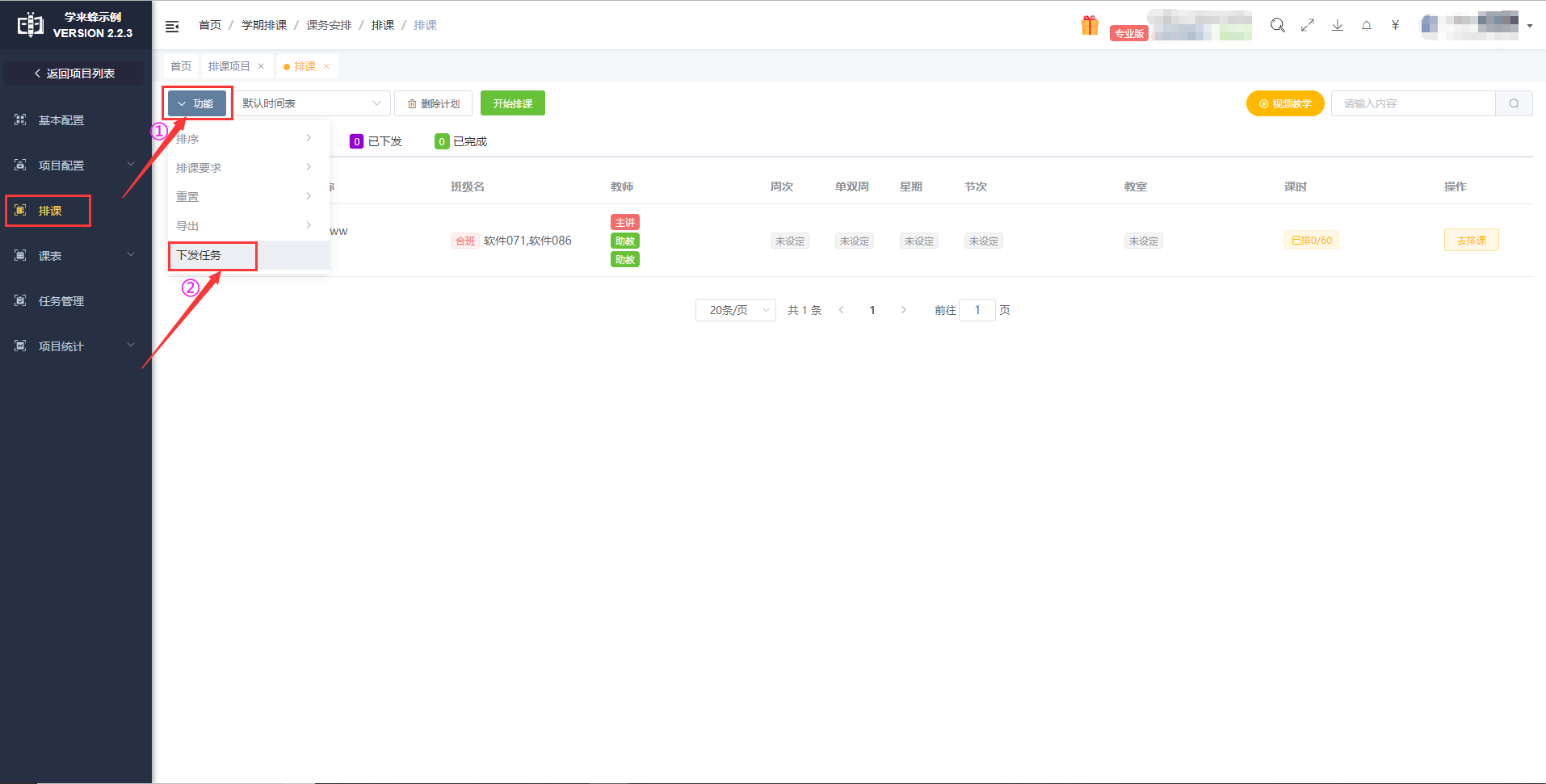 勾选课程信息,点击功能列表中的下发任务选项,弹出分配排课任务操作框,填写任务分配详情,点击提交按钮,完成下发排课任务操作。