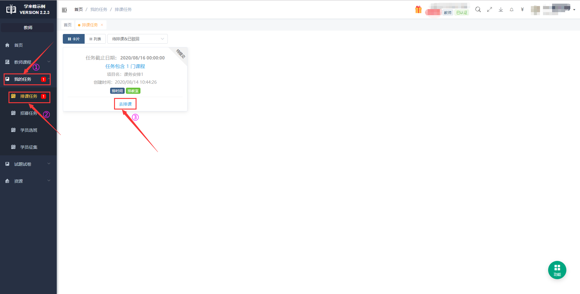 拥有排课任务的人员登陆自己的系统,点击我的任务按钮,选择排课任务选项,在排课任务页面中,点击每一个排课任务中的去排课按钮,进入排课信息介绍页面,点击开始排课按钮,进入排课页面进行排课操作。